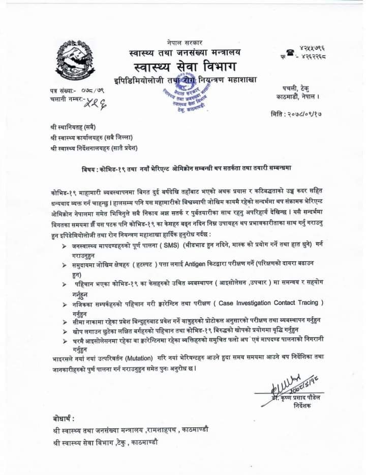 काठमाडौँ/ स्वास्थ्य तथा जनसङ्ख्या मन्त्रालयले कोभिड–१९ तथा नयाँ भेरिएन्ट ओमिक्रोन फैलन नदिन देशभरका स्थानीय तह, प्रदेश सरकार र स्वास्थ्य कार्यालयहरूलाई थप सतर्कता अपनाउन आग्रह गरेको छ ।