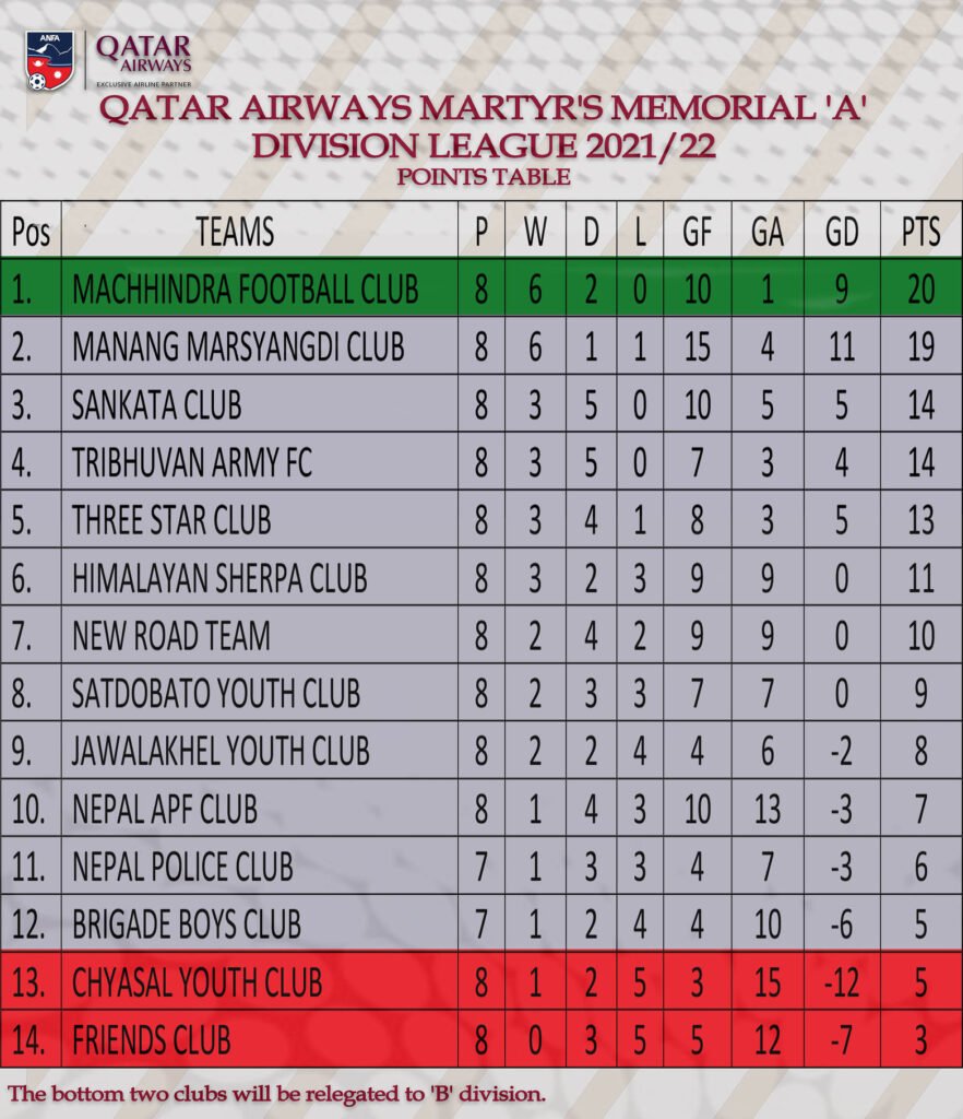 जितपछी थ्री स्टार आठ खेलमा १३ अंकसहित पाँचौ स्थानमा उक्लिदा समान खेलमा ११ अंक बटुलेको हिमालयन शेर्पा छैटौं स्थानमा झरेको छ ।