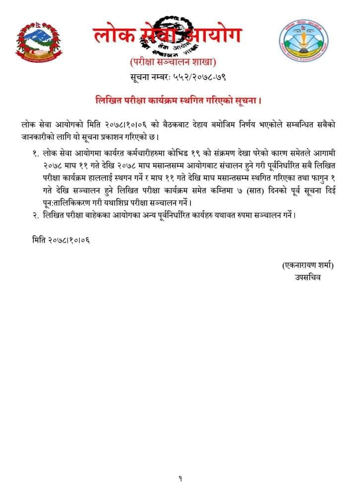 आयोगले माघ ११ गतेदेखि माघ मसान्तसम्म सञ्चालन हुने लिखित परीक्षा स्थगित गरिएको जनाएको छ । यस्तै, फागुन १ गतेदेखि सञ्चालन हुने लिखित परीक्षासमेत कम्तीमा सात दिनको पूर्वसूचना दिई पुन:तालिकिकरण गरी सञ्चालन गर्ने आयोगले जनाएको छ ।