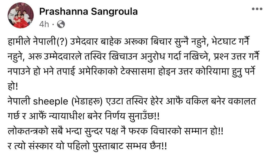 नेपाली समाज टेक्सासका पूर्व अध्यक्ष भुवन आचार्यले ‘नेपालीलाई ढुबाएर, नेपालीकै नेता हुन खोजेका नेपाली पात्रहरु’ भन्दै फोटो सहितको स्टाटस लेखे । त्यस पछि अन्यले पनि यही दोहोर्याए ।