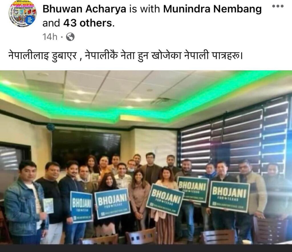 भोजानी टेक्सास राज्य संसद (हाउस डिस्ट्रीक) एचडी ९२ मा डेमोक्रेटिभ पार्टीको तर्फबाट उमेदवार बान्न प्रयासरत छन् । उनले आइतवार दक्षिण एशियालीमुलका समुदाय सँग भेटघाट राखेका थिए । यसै क्रममा टेक्सासमा रहेका नेपाली सँग पनि भेट गरेको फोटो भोजानीले आइतवार ट्वीट मार्फत सार्वजनिक गरे । जसमा भनिएको छ ‘नेपाली अमेरिकी समुदायका नेताहरूसँग अद्भुत भेट भयो! म उनीहरूको समर्थन पाएकोमा सम्मानित छु, ।’