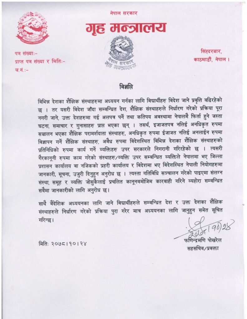 ‘गैरकानुनी काम गर्ने शैक्षिक परामर्शदाता संस्थाहरु, अनधिकृत रुपमा ईजाजत नलिई अनलाईन रुपमा विज्ञापन गर्ने शैक्षिक संस्थाहरु, अवैध रुपमा विदेशस्थित विभिन्न देशका शैक्षिक संस्थाहरुको प्रतिनिधिको रुपमा कार्य गर्ने व्यक्तिहरु उपर सरकारले निगरानी गरिरहेको छ,’ गृह मन्त्रालयले जारी गरेको विज्ञप्तिमा भनिएको छ, ‘त्यस्ता गतिविधिमा संलग्न हुने जोसुकैलाई पनि प्रचलित कानुन बमोजिम कारबाही गरिनेछ।’