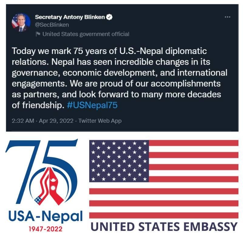 नेपाल-अमेरिका कूटनीतिक सम्बन्धको ७५ औं वर्षगाँठको अवसरमा अमेरिकी विदेशमन्त्री एन्थोनी ब्लिंकेनले जारी गरेको सन्देशमा “नेपालले आफ्नो शासन प्रणाली, आर्थिक विकास, तथा अन्तराष्ट्रिय सहभागिताहरूमा उल्लेखनीय परिवर्तन अनुभुत गरेको छ,” भनेका छन्।