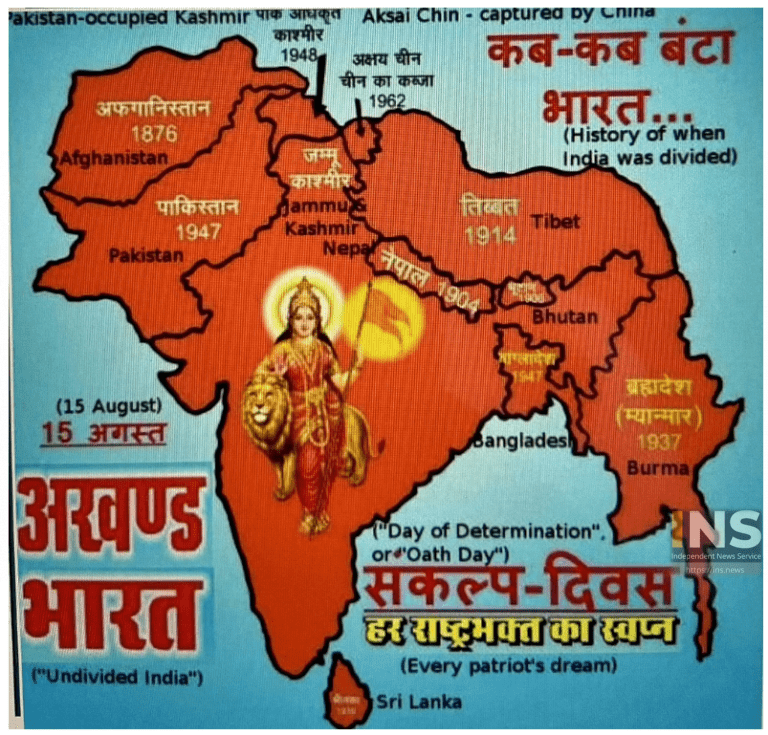 काठमाडौं। भारतको अतिवादी हिन्दु संगठन–राष्ट्रिय स्वयम् सेवक संघ (आरएसएस) सदस्यहरू अफगानिस्तान, पाकिस्तान, बंगलादेश, श्रीलंका, म्यानमार, तिब्बत, भुटान, नेपालदेखि अक्साई चीनसम्मको भूभागलाई समेटिएको ‘अखण्ड भारत‘ को नक्सा राख्न थालेका छन्।