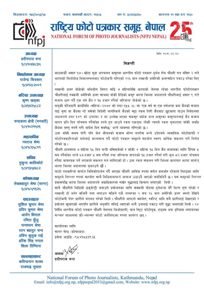 नक्कली अमेरिकी डलर बोकेको आरोपमा जेल परेका भारतीय फोटो पत्रकार दुर्लभलाई छुटाउन एनएफपिजेले आर्थिक संकलन गर्ने