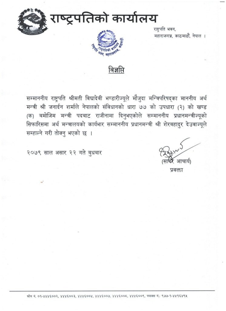 बुधबार राष्ट्रपति विद्यादेवी भण्डारीले नेपालको संविधानको धारा ७७ को उपधारा (२) को खण्ड (क) बमोजिम मन्त्री पदबाट अर्थमन्त्री शर्मा राजीनामा दिएको हुनाले अर्थ मन्त्रालयको जिम्मेवारी प्रधानमन्त्री देउवालाई तोकेकी छन् ।