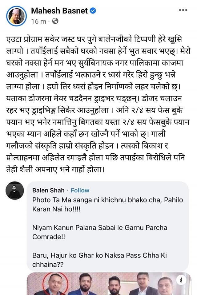 यस बिषयलाई लिएर एमाले नेता महेश बस्नेतले ब्याङ्ग्य गर्दै मेयर बालेनप्रति २-४ सय फेसबुके फ्यान भएर नमात्तिन सल्लाह दिएका छन्।