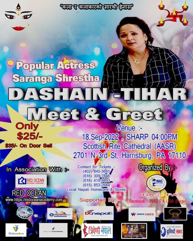 अन्तर्राष्ट्रिय कलाकार समाज (ईनास) पेन्सेलभेनिया अमेरिकाले यो अवसर जुराएको हो। दशैँ-तिहार सांगितिक कार्यक्रममा सेप्टेम्बर अठार तारिक आइतवार साँझ चार बजे देखि ह्यारिसबर्ग स्थित स्कटिस राइट ,क्याथेड्रल (एएएसआर) 2701 N 3rd St , Harrisburg, PA 17110 मा शुरु हुने छ।