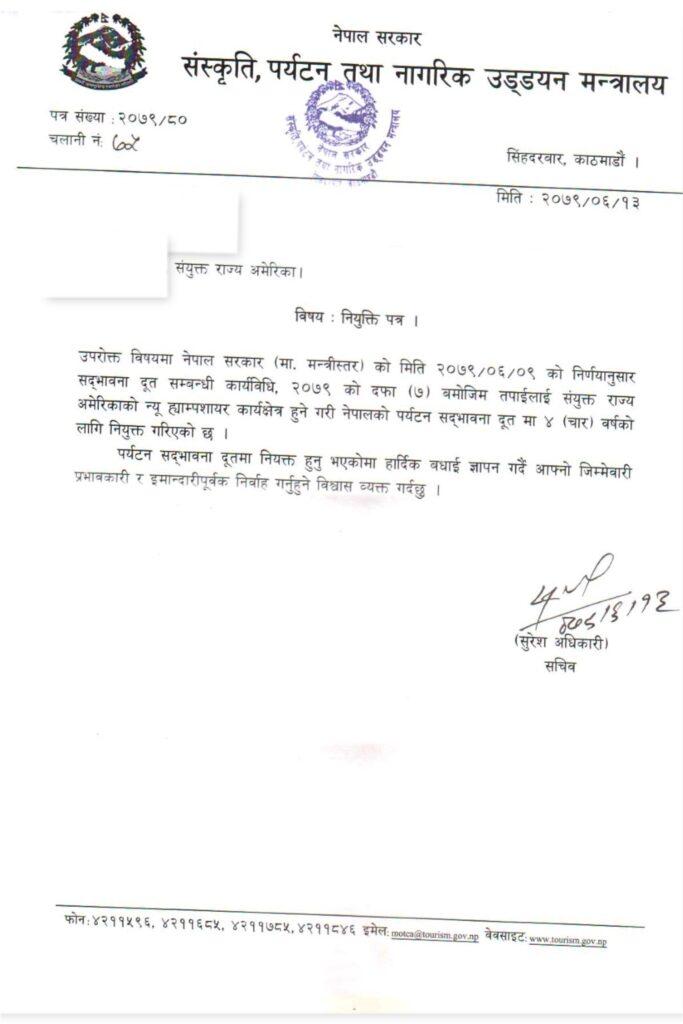नेपाल सरकार संस्कृति, पर्यटन तथा नागरिक उड्डयन मन्त्रालयले (अक्टोबर २९ तारिक) असोज १३ गतेको मितिमा अमेरिकामा रहेका पाँच जनालाई पर्यटन सद्भावना दूत नियुक्त गरेको जनाएको छ।