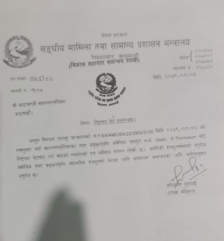 सोही दिन संघीय मामिला तथा सामान्य प्रशासन मन्त्रालयले काठमाडौं महानगरलाई अमेरिकी दूतावासको आग्रहअनुसार आवश्यक समन्वय गर्न भन्दै पत्र लेखिएको छ ।