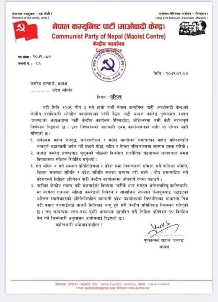 ‘पार्टीका केन्द्रीय सदस्य बद्री बजगाईंको विषयमा पार्टीकै भ्रातृ संगठन अखिल क्रान्तिकारीमा कार्यरत एकजना महिला कमरेडको निवेदन र सामाजिक सञ्जाल फेसबुकबाट पठाइएका अश्लील म्यासेजहरुको प्रतिलिपिसहित बागमती प्रदेश कार्यालयको सिफारिसका आधारमा निज बद्रीप्रसाद बजगाइँलाई आजकै मितिबाट लागू हुने गरी केन्द्रीय समितिबाट निलम्बन गरिएको छ’ माओवादीको आन्तरिक सर्कुलरमा भनिएको छ, ‘तत् सम्बन्धमा सत्यतथ्य बुझी आवश्यक छानबिन गरी लिखित प्रतिवेदन १० दिनभित्र पेश गर्ने जिम्मेवारी अनुशासन आयोगलाई दिइएको छ ।’