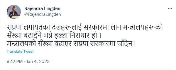 मन्त्रालयको संख्या बढाएर राप्रपा सरकारमा नजाने उनले बताएका छन् । मन्त्रिपरिषद विस्तारको तयारी भइरहेका बेला उनको यो अभिव्यक्ति आएको छ । उनले लेखेका छन्, “राप्रपा लगायतका दलहरुलाई सरकारमा लान मन्त्रालयहरुको संख्या बढाइदिने भन्ने हल्ला निराधार हो । मन्त्रालयको संख्या बढाएर राप्रपा सरकारमा जाँदैन ।”