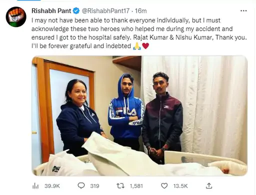 विकेटकिपर ब्याट्सम्यानले लगातार तीनवटा पोस्ट गरेका छन् । उनले आफ्नो अन्तिम पोस्टमा दुर्घटनापछि आफूलाई मद्दत गर्ने रजत र निशु नामका युवकहरूलाई पनि सम्झेका छन् । उनले लेखेका छन्, ‘हुन सक्छ, मैले व्यक्तिगत रूपमा सबैलाई धन्यवाद दिन नसकूँ तर मैले दुई हिरोलाई धन्यवाद दिनैपर्छ जसले दुर्घटनापछि मेरो मद्दत गरे र मलाई सुरक्षित अस्पताल पुर्याए । रजत कुमार र निशु कुमार, धन्यवाद । म सधैँ तपाईंहरुको आभारी र ऋणी रहनेछु ।’
