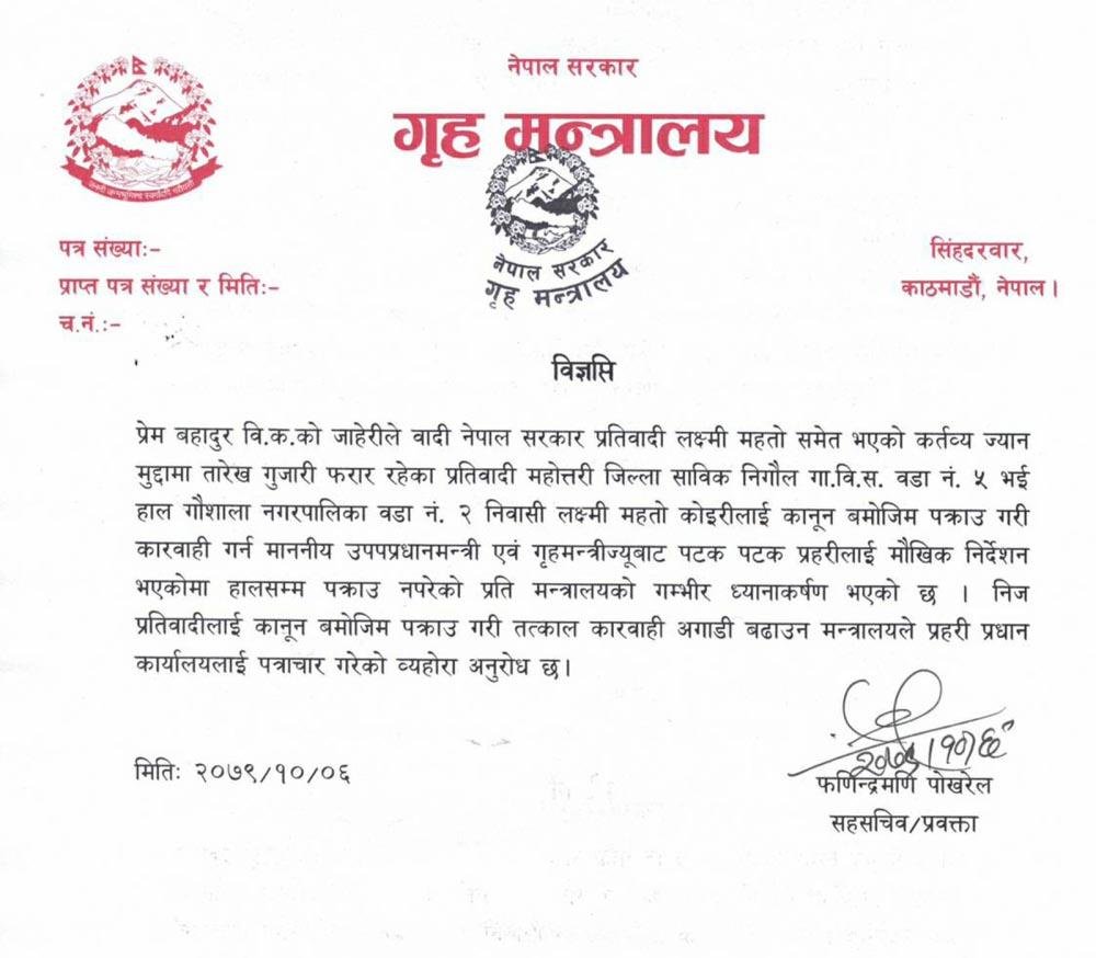 काठमाडौं । नेकपा एमालेका सांसद लक्ष्मी महतो कोइरीलाई पक्राउ गर्न गृह मन्त्रालयले प्रहरी प्रधान कार्यालयलाई निर्देशन दिएको छ ।