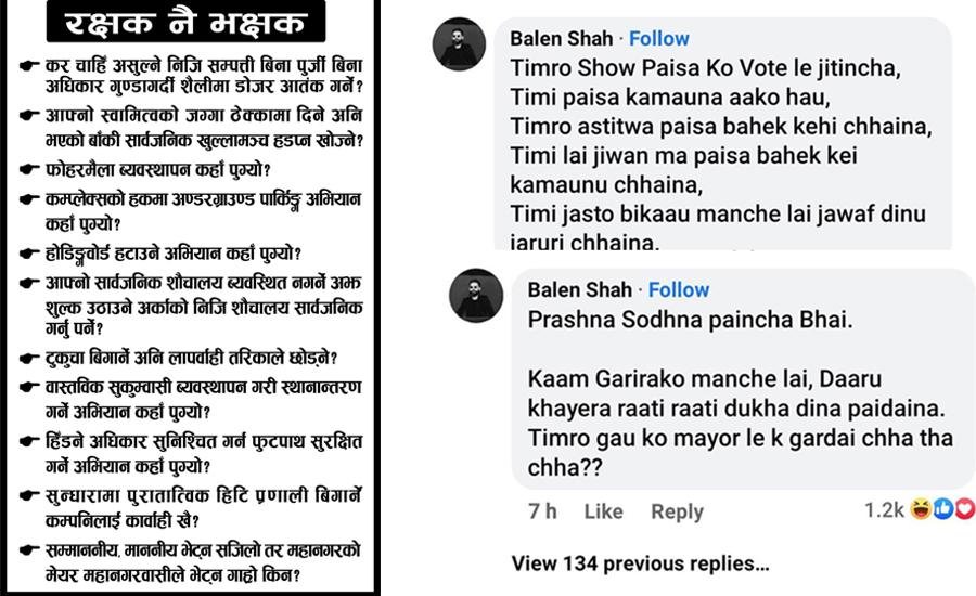 सार्वजनिक रुपमा प्रश्न गरेका भण्डारीलाई मेयर बालेनले व्यक्तिगत लाञ्छना र उनको व्यवसायमाथि उल्टो प्रश्न गर्दै कमेन्टमा लेखेका छन् ‘तिम्रो शो पैसाको भोटले जितिन्छ । तिमी पैसा कमाउन आएको हौ । तिम्रो अस्तित्व पैसाबाहेक केही छैन । तिमी जस्तो बिकाउ मान्छेलाई जवाफ दिन जरुरी छैन ।’