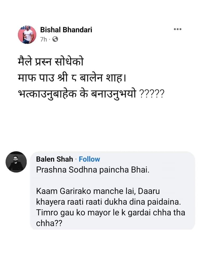 सार्वजनिक रुपमा प्रश्न गरेका भण्डारीलाई मेयर बालेनले व्यक्तिगत लाञ्छना र उनको व्यवसायमाथि उल्टो प्रश्न गर्दै कमेन्टमा लेखेका छन् ‘तिम्रो शो पैसाको भोटले जितिन्छ । तिमी पैसा कमाउन आएको हौ । तिम्रो अस्तित्व पैसाबाहेक केही छैन । तिमी जस्तो बिकाउ मान्छेलाई जवाफ दिन जरुरी छैन ।’