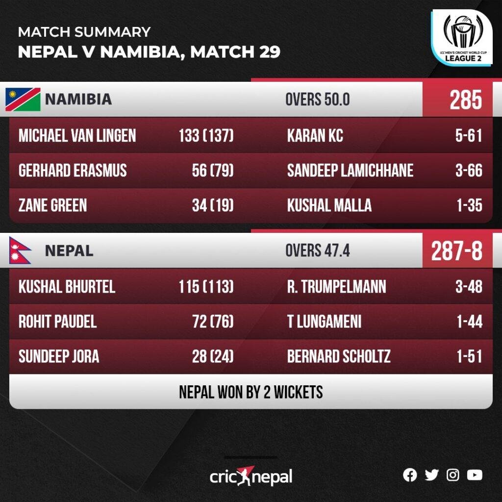 आईसीसी विश्वकप लिग टु क्रिकेट : नेपालले नामिबियालाई दुई विकेटले हरायो, कुशलको सतक