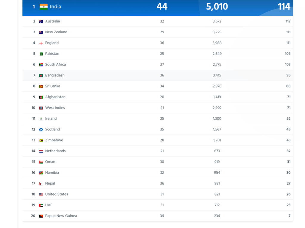 आईसीसीको वरियतामा भारत पहिलो र अष्टेलिया दोस्रो स्थानमा रहेको छ भने न्युजिल्याण्ड तेस्रो स्थानमा रहेको छ । नेपाल अहिले अमेरिका, युएई र पपुवा न्युगिनीभन्दा अगाडि रहेको छ । नामेविया नेपालभन्दा माथि रहेको छ ।