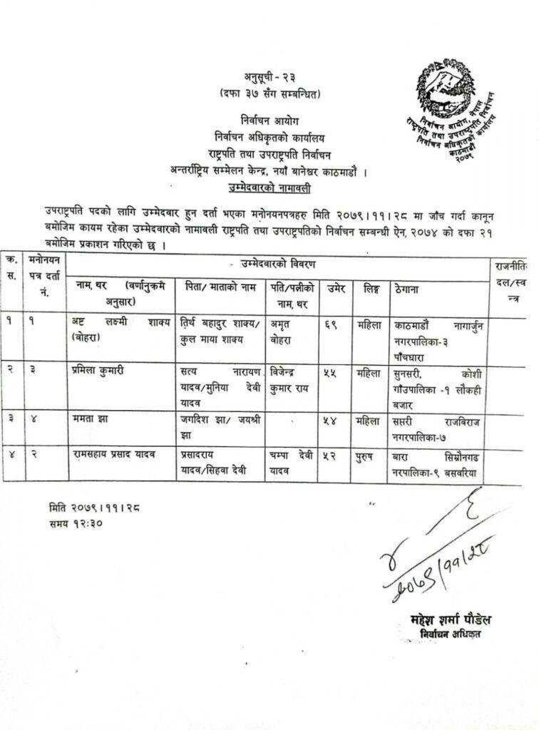 उपराष्ट्रपति निर्वाचन : चारजनाको उम्मेदवारी कायम