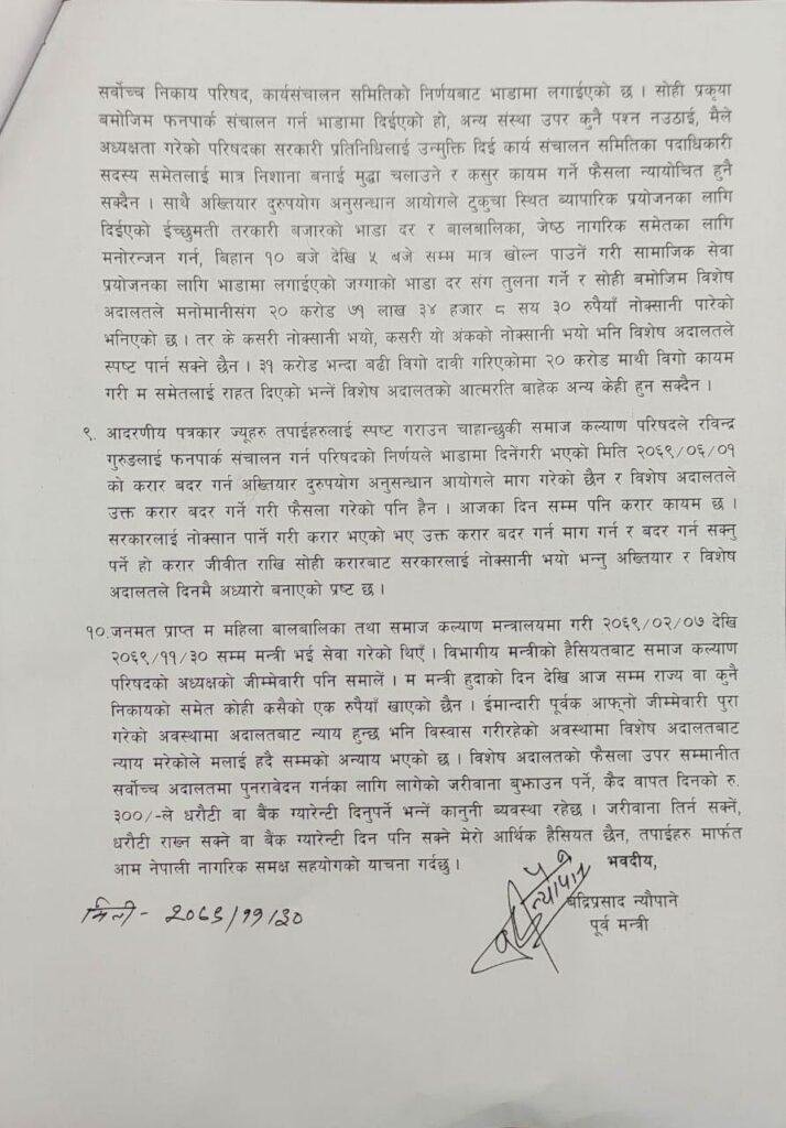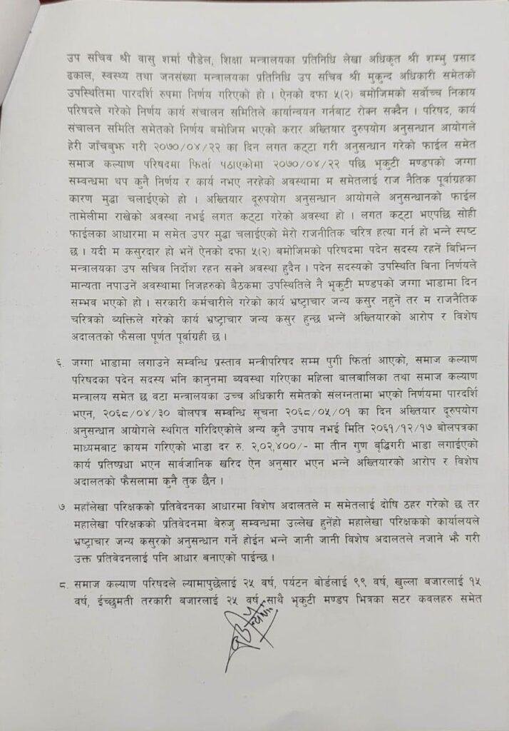 ‘समाज कल्याण परिषद्, समाज कल्याण ऐन, २०४९ को दफा ६ अनुसारको स्वशासित र संगठित संस्थाले सोही ऐनको दफा ६ को उपदफा (३) बमोजिम आफ्नो सम्पत्ति प्राप्त गर्न, उपभोग गर्न, बेचविखन वा अन्य किसिमले व्यवस्था गर्न पाउने कानुनी व्यवस्थाबमोजिम भृकुटीमण्डपको जग्गा भाडामा दिन मन्त्रिपरिषदमा प्रस्ताव लगि, मन्त्रिपरिषद्ले समाज कल्याण परिषद्बाट स्विकृति लिई रहन पर्दै भनि मन्त्रिपरिषद्बाट प्रस्ताव फिर्ता आएकाले समाज कल्याण ऐन, २०४९ को दफा ५(१)(२) बमोजिमको १८ सदस्यीय परिषद् (समाज कल्याण परिषद्को सर्वोच्च निकाय) ले जग्गा भाडामा दिनेगरि निर्णय गरेकोले सोही निर्णयबमोजिम ऐनको दफा १० बमोजिमको ७ सदस्यीय कार्य सञ्चालन समितिको निर्णयले करार गरी भाडामा लगाउँदा परिषद्लाई नोक्सानी र म समेतलाई फाइदा हुन सक्ने अवस्था कहीँ कतैबाट देख्न देखाउन विशेष अदालतले सक्नेछैन,’ पत्रकार सम्मेलनमा उनले जारी गरेको वक्तव्यमा उल्लेख छ ।