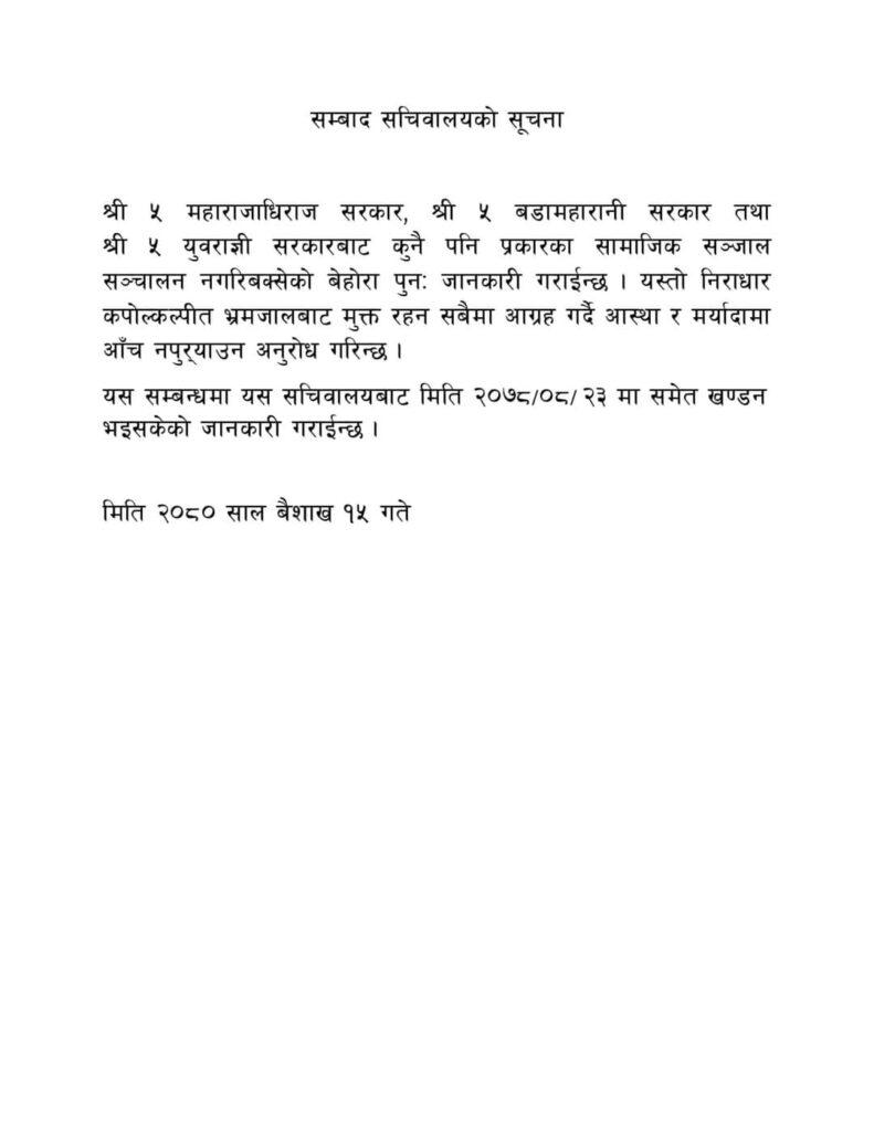 यसअघि २३ मंसिर २०७८ मा पनि सचिवालयले पूर्वराजा शाह, पूर्वरानी कोमल र पूर्वयुवराज्ञी हिमानीले सामाजिक सञ्जाल सञ्चालन नगरेको जानकारी गराइसकेको स्मरण गराएको छ ।