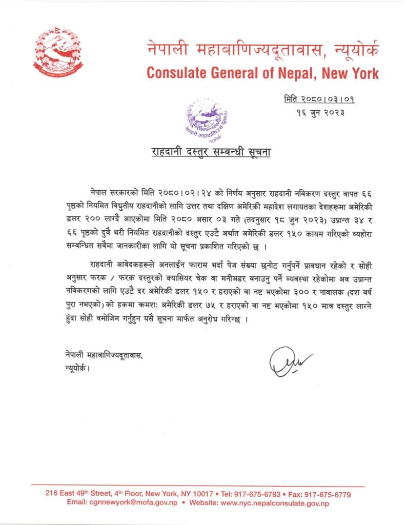 उत्तर अमेरिकामा यस अगाडि ६६ पृष्टको नियमित विद्युतिय पासपोर्टको दुई सय अमेरिकी डलर शुल्क लाग्दै आएकोमा अब एक सय पचास डलर कायम गरिएको छ।