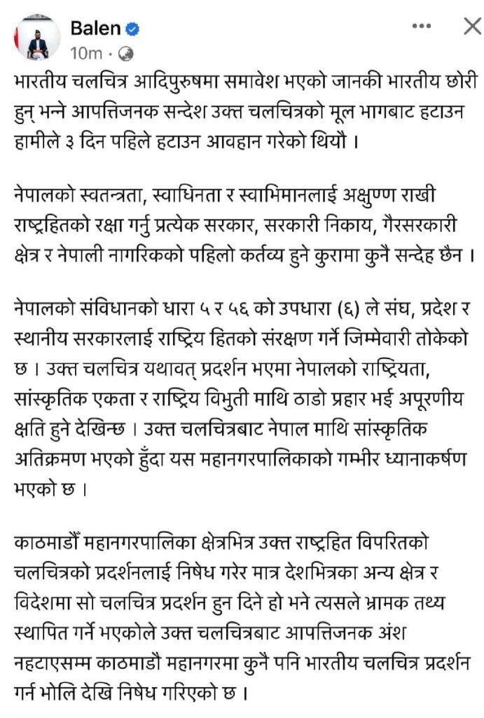 दक्षिण भारतीय फिल्म ‘आदिपुरुष’मा समावेश ‘जानकी भारतकी छोरी हुन्’ भन्ने वाक्यलाई भारतमा सच्याउन मेयर साहले फेसबुक स्टाटसमार्फत तीन दिनको समय दिनुभएको थियो । आइतबार बेलुकासम्म फिल्म निर्माताले भारतमा उक्त संवादलाई सच्याएका छैनन् ।
