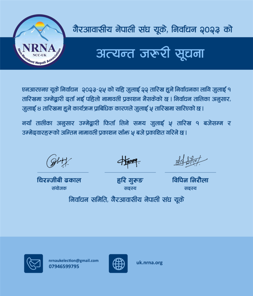 एनआरएनए युकेको निर्वाचन कार्य तालिका परिमार्जन