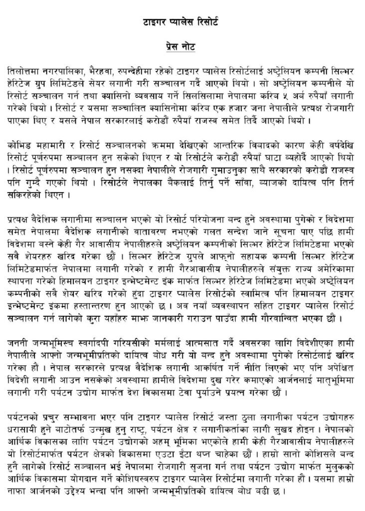 बुधबार पत्रकार सम्मेलन मार्फत रिसोर्टले अष्ट्रेलियन कम्पनी सिल्भर हेरिटेज ग्रुप लिमिटेडले सेयर लगानी गरी सञ्चालन गर्दै आएको उक्त रिसोर्ट विदेशमा बस्ने गैर आवासीय नेपालीहरुले सवै शेयरहरु खरिद गरी नयाँ व्यवस्थापन सहित सञ्चालनमा ल्याउने जानकारी दिएको हो ।