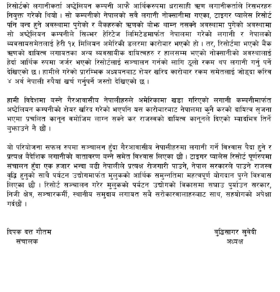उनले भने,‘प्रत्यक्ष वैदेशिक लगानीमा सञ्चालन भएको यो रिसोर्ट परियोजना बन्द हुने अवस्थामा पुगेको र विदेशमा समेत नेपालमा वैदेशिक लगानीको वातावरण नभएको गलत सन्देश जाने सूचना पाए पछि हामी विदेशमा बस्ने केही गैर आवासीय नेपालीहरुले अष्ट्रेलियन कम्पनीको सिल्भर हेरिटेज लिमिटेडमा भएको सवै शेयरहरु खरिद गरेका छौं ।’