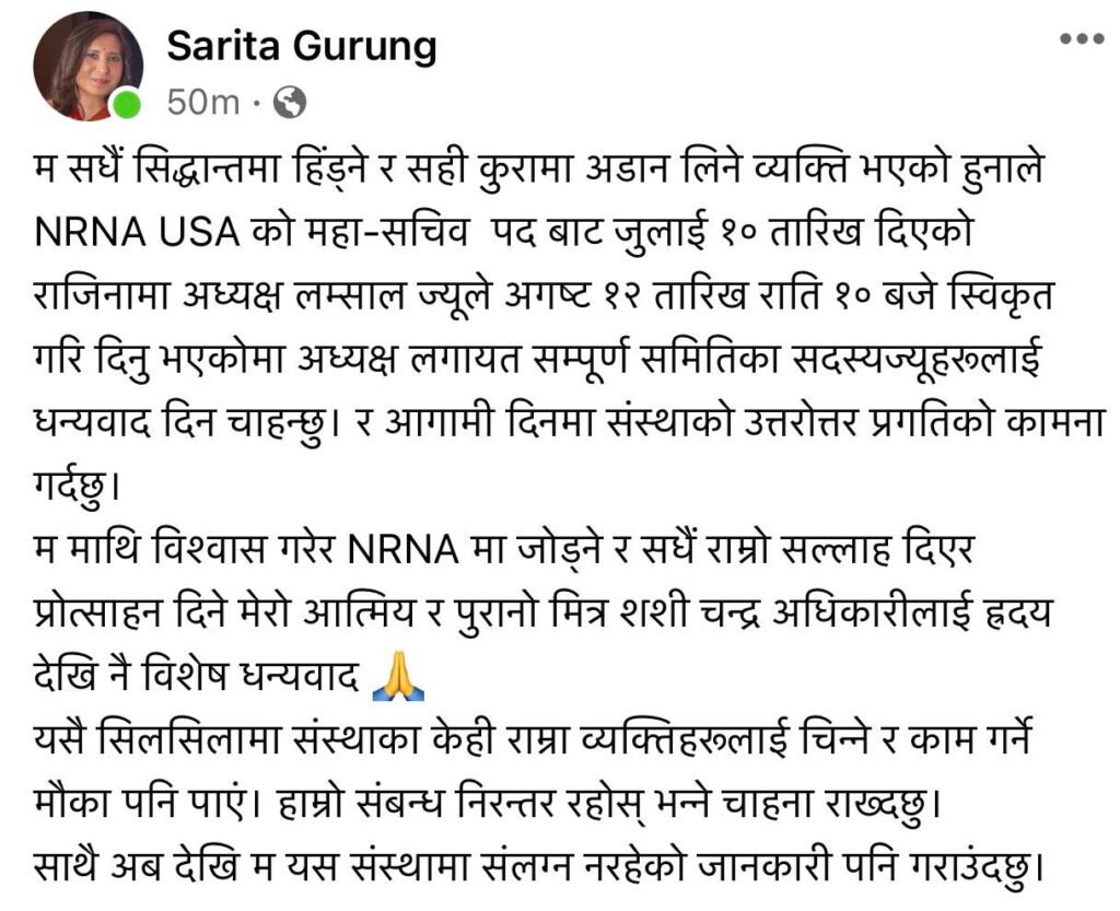 ‘म सधैँ सिद्धान्तमा हिँड्ने र सही कुरामा अडान लिने व्यक्ति भएको हुनाले एनआरएनए यूएसए महा-सचिव पद बाट जुलाई १० तारिख दिएको राजीनामा अध्यक्ष लम्साल ज्यूले अगस्ट १२ तारिख राति १० बजे स्वीकृत गरी दिनु भएकोमा अध्यक्ष लगायत सम्पूर्ण समितिका सदस्यज्यूहरूलाई धन्यवाद दिन चाहन्छु।’ गुरुङले सामाजिक सञ्जालमा लेखेकी छिन्।