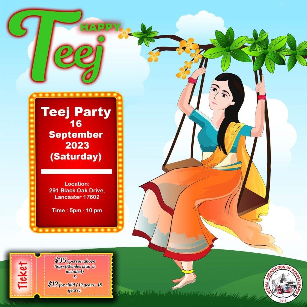 एसोसिएसनकी कोषाध्यक्ष अञ्जलिका के.सी.का अनुसार सेप्टेम्बर १६ तारिख शनिवार ल्यानक्यास्टरको लिङ्कन हाइवे नजिक (291 Black Oak Driv,Lancaster17602) तीजको उपलक्ष्यमा सांस्कृतिक कार्यक्रम तय गरिएको छ।