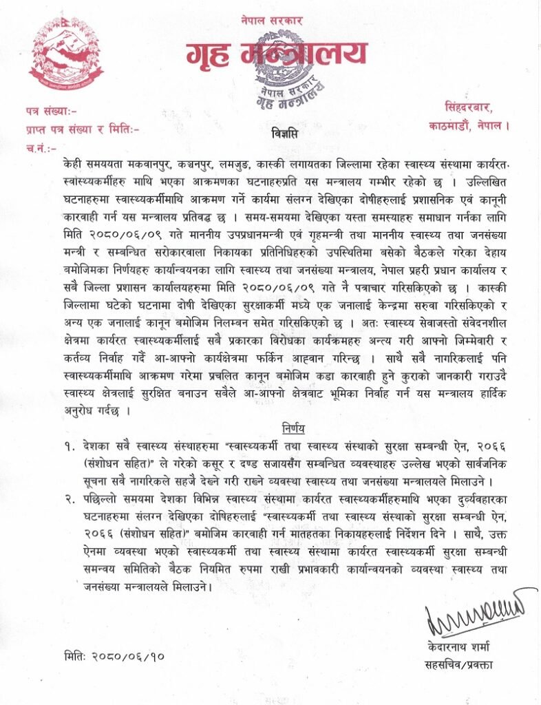 यस्तै गृह मन्त्रालयले स्वास्थ्य संस्थामा कार्यरत स्वास्थ्यकर्मीहरूमाथि भएका दुर्व्यवहारका घटनामा संलग्न दोषीलाई ऐन बमोजिम कारबाही गर्न पनि मातहतका निकायलाई निर्देशन दिएको छ ।