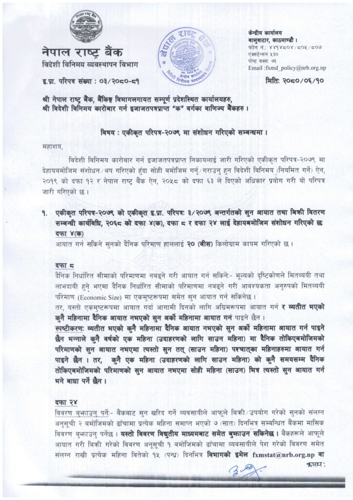 केन्द्रीय बैंकले एक परिपत्र जारी गर्दै अब २० किलोसम्म सुन ल्याउन दिने भएको हो । यसअघि दैनिक १० किलो मात्रै सुन आयात गर्न दिइरहेको थियो ।