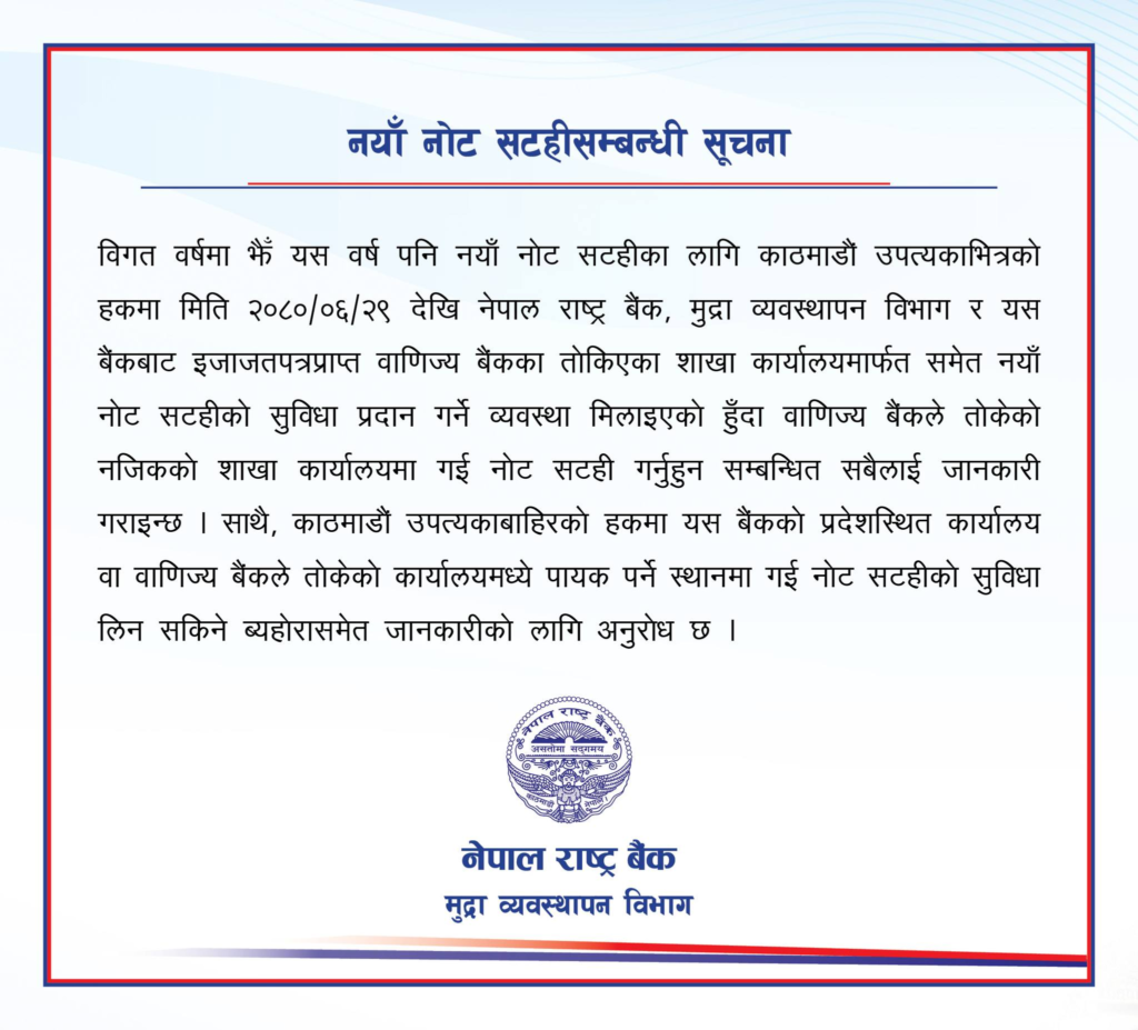 राष्ट्र बैंकले हरेक वर्ष चाडबाडमा नयाँ नोट सटहीको सुविधा दिँदै आएको छ। काठमाडौं उपत्यकाभित्रको हकमा राष्ट्र बैंकअन्तर्गतको मुद्रा व्यवस्थापन विभाग र विभिन्न वाणिज्य बैंकका शाखामार्फत नयाँ नोट सटही गर्न सकिनेछ।