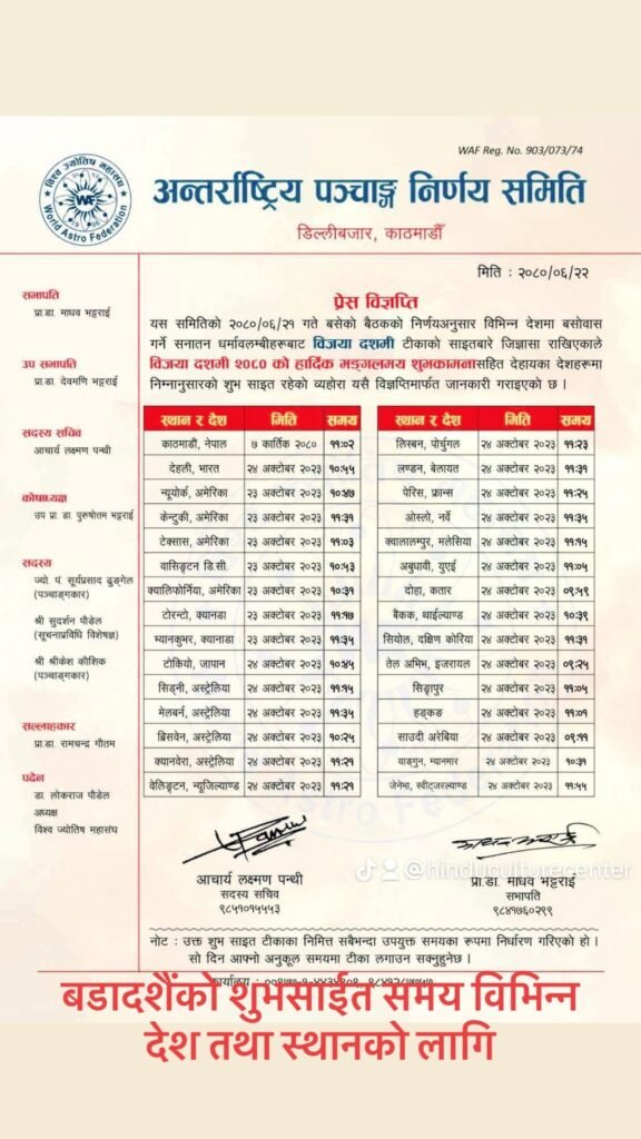 नेपाल पञ्चाङ्ग निर्णायक विकास समिति र अन्तर्राष्ट्रिय पञ्चाङ्ग निर्णय समितिको असोज २१ गते बसेको बैठकले टीकाको शुभ साइत र समय तालिका निर्धारण गरेका छन् ।