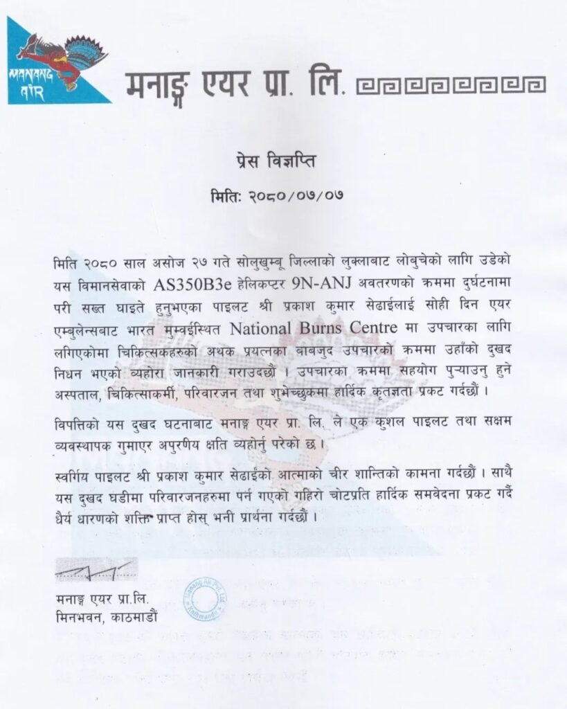 विज्ञप्ति जारी गर्दै प्रालिले भनेको छ, ‘चिकित्सकहरुको अथक प्रयत्नका बाबजुद उपचारका क्रममा उहाँको दुःखद निधन भएको व्यहोरा जानकारी गराउँदछौं ।