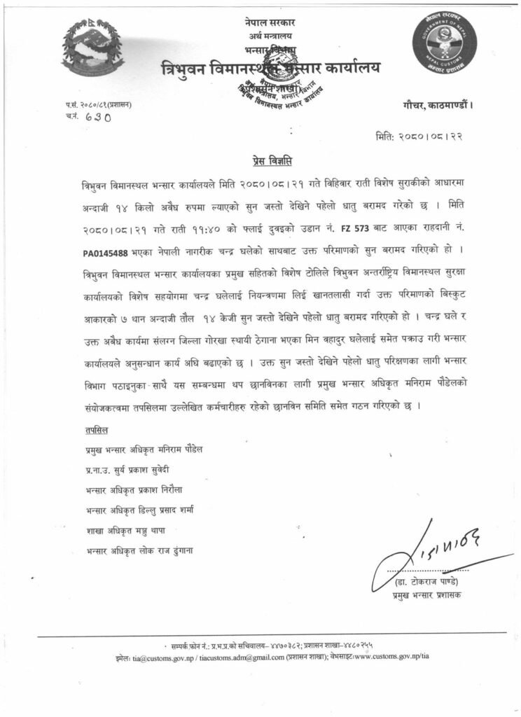 बिहीबार राति दुबईबाट आएका चन्द्र घलेको साथबाट करिव १४ किलो सुन बरामद भएको थियो ।