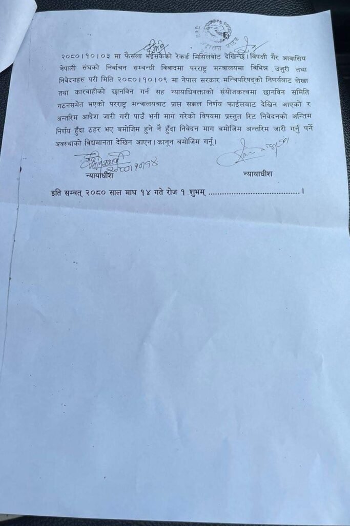 न्यायाधीश शालिग्राम कोइराला र चन्द्रमणि ज्ञवालीको इजलासले आइतबार पक्ष र विपक्षमा परेको रिटका सम्बन्धमा छलफल गर्दा परराष्ट्र मन्त्रालयमा विभिन्न उजुरीहरु परेको र विवादमा सम्बन्धमा छानविन समिति समेत बनिसकेकाले अन्तरिम आदेश दिन नपर्ने ठहर गरेको हो ।