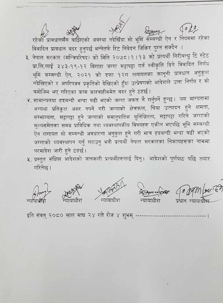 ‘विवादित निर्णय भूमिसम्बन्धी ऐन, २०२१ को दफा १२९ग० लगायतका कानुनी प्रावधान अनुकूल नदेखिएको र अपरिपक्व प्रकृतिको देखिएको हुँदा उत्प्रेषणको आदेशले उक्त निर्णय र सो बमोजिम भए गरिएका काम कारबाहीसमेत बदर हुने ठहर्छ,’ सर्वोच्चको आदेशमा उल्लेख छ ।