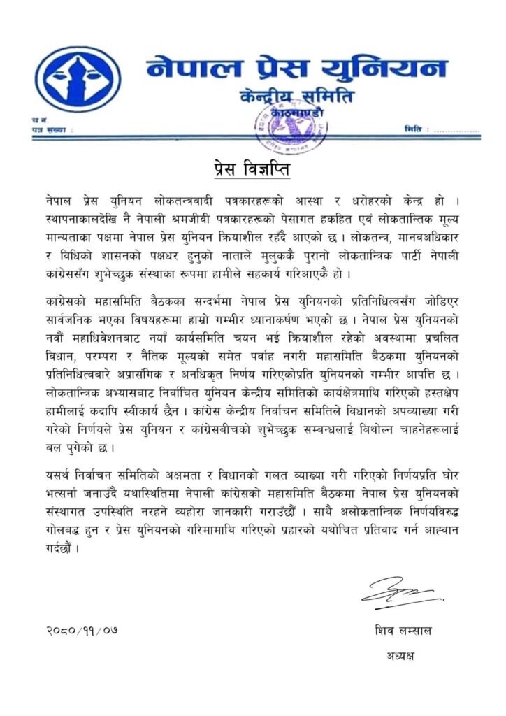 ‘कांग्रेसको महासमिति बैठकका सन्दर्भमा प्रेस युनियनको प्रतिनिधित्वसँग जोडिएर सार्वजनिक भएका विषयहरुमा हाम्रो गम्भीर ध्यानाकर्षण भएको छ । नेपाल प्रेस युनियनको नवौं महाधिवेशनबाट नयाँ कार्य समिति चयन भइ नयाँ कार्यसमिति चयन भई क्रियाशील रहेको अवस्थामा प्रचलित विधान, परम्परा र नैतिक मूल्यको समेत प्रर्वाह नगरी महासमिति बैठकमा युनियनको प्रतिनिधित्वबारे अप्रासंगिक र अनधिकृत निर्णय गरिएको निर्णयप्रति युनियनको गम्भीर आपत्ति छ । लोकतान्त्रिक अभ्यासबाट निर्वाचित युनियन केन्द्रीय समितिको कार्यक्षेत्रमाथि गरिएको हस्तक्षेप हामीलाई कदापि स्वकार्य छैन् । कांग्रेस केन्द्रीय निर्वाचन समितिले विधानको अपब्याख्या गरी गरेको निर्णयले प्रेस युनियन र कांग्रेसविचको शुभेच्छुक सम्बन्धलाई विथोल्न चाहनेहरुलाई बल पुगेको छ,’अध्यक्ष लम्सालद्धारा जारी विज्ञप्तिमा भनिएको छ ।