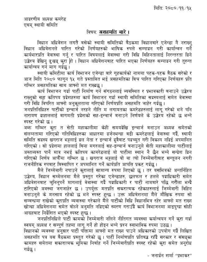 पार्टी कार्यालय पेरिसडाँडामा बसेको स्थायी कमिटीको बैठकमा पार्टीको कार्यविभाजनको निर्णयप्रति लिखित असहमति राख्दै उनले सो बताएका हुन् । स्थायी समिति सदस्य खगराज भट्टलाई दल नेता र इन्चार्ज दुवैबाट पदच्यूत गरेर प्रदेशमा हाललाई विना मगरलाई सह–इन्चार्जको जिम्मेवारी दिइएको छ ।