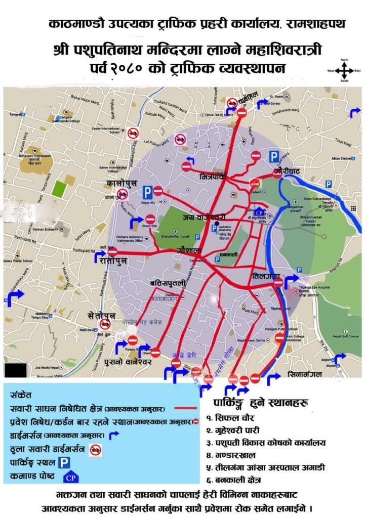 काठमाडौं । महाशिवरात्री पर्वको अवसरमा पशुपति क्षेत्रमा हुने भक्तजनको घुँइचोलाई लक्षित गर्दै प्रहरीले सवारी डाइभर्सन गरेको छ । प्रहरीले महाशिवरात्रीलाई लक्षित गरी ५१३ जना ट्राफिक प्रहरी त्यस क्षेत्रमा खटाएको छ ।