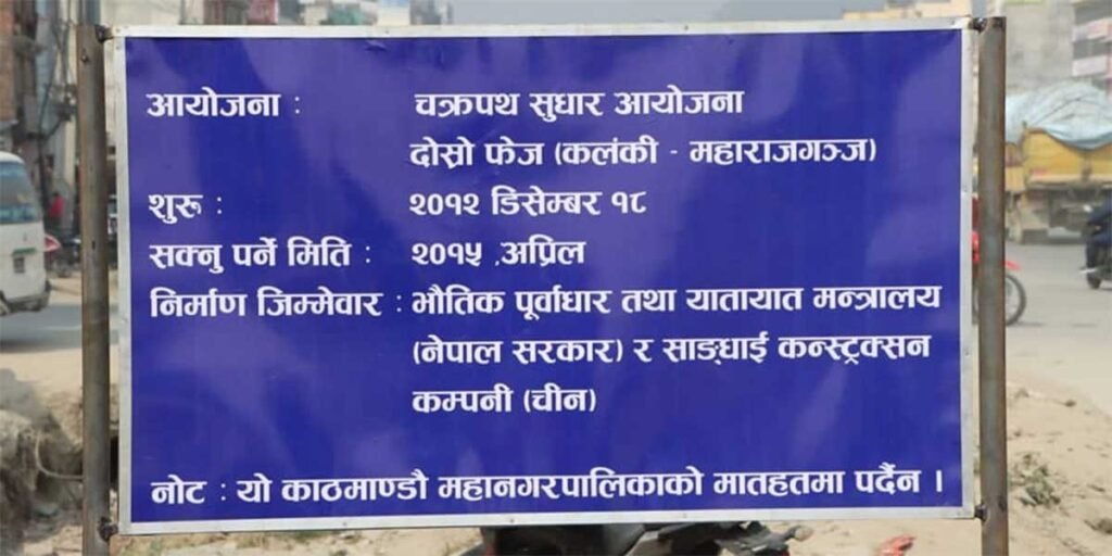 चक्रपथ सुधारको दोस्रो फेज (कलङ्की – महाराजगन्ज) को कामका लागि सन् २०१२ डिसेम्बर १८ मा नेपाल सरकार र चीन सरकारकातर्फबाट निर्माण पक्षले गरेको सम्झौतामा नेपाल सरकारले १ महिना भित्र साइट क्लियर गर्ने, निर्माण पक्षले त्यसको २ महिना भित्र निर्माणका लागि सबै पूर्व तयारीको काम सिद्ध्याउने र तेस्रो महिनाबाट काम थाल्ने उल्लेख छ । ४० (३ वर्ष ४ महिना) महिना भित्र आयोजनालाई पूर्ण रूपमा सम्पन्न गर्ने लक्ष्य राखिएको योजना १४४ (१२ वर्ष) महिना बितिसक्दा थालनी हुनेसम्मको पनि सङ्केत देखिँदैन ।