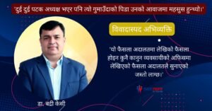 पेन्सिल्भेनिया/ गैर आवासीय नेपाली संघ (एनआरएनए) अन्तर्राष्ट्रिय समन्वय परिषद् (आइसीसी) का सबै समानान्तर कमिटीहरूलाई अवैध घोषणा गर्दै ६ महिनाभित्र एकताको अधिवेशन गर्नका लागि सर्वोच्च अदालतले फैसला गरेपछि सचिवालय कब्जा गरेर बसेको डा. बद्री केसी समूह अहिले अत्तालिएको छ । सर्वोच्च अदालतका न्यायाधीश द्वय सपना प्रधान मल्ल र डा. नहकुल सुवेदीको संयुक्त इजलासले गत बुधवार दशौं … Continue reading एनआरएनए अभियन्ता डा. बद्री केसीको अभद्रता