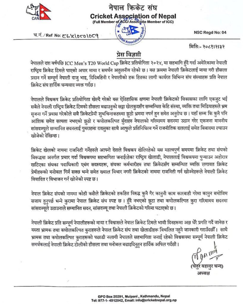 क्यानका अध्यक्ष चतुर बहादुर चन्दले शुक्रबार एक विज्ञप्ति जारी गर्दै सांसद आचार्यले संसदमा नेपाली क्रिकेटको विषयमा उठाएको विषयले नेपाली क्रिकेट, संसद र सांसदको गरिमा घटाएको उल्लेख गरेका छन् । उनले हुदै नभएको कपोकल्पित कुरा सांसदले उठाएको बताएका छन् ।