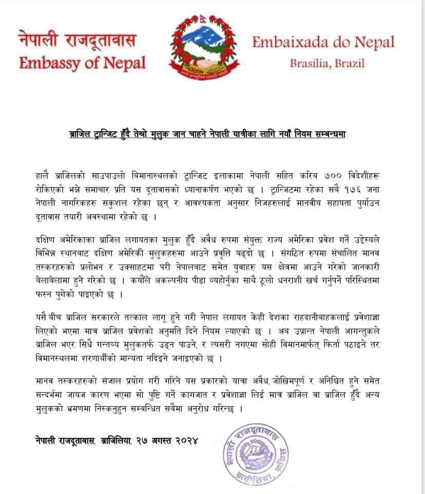 मानव तस्करको सञ्जाल प्रयोगगरी गरिने यस प्रकारको यात्रा अवैध, जोखिमपूर्ण र अनिश्चित हुने सन्दर्भमा जायज कारण भएमा सो पुष्टि गर्ने कागजात र प्रवेशाज्ञा लिई मात्र ब्राजिल वा ब्राजिल हुँदै अन्य मुलुकको भ्रमणमा निस्कनु हुन दूतावासले अनुरोध गरेको छ ।