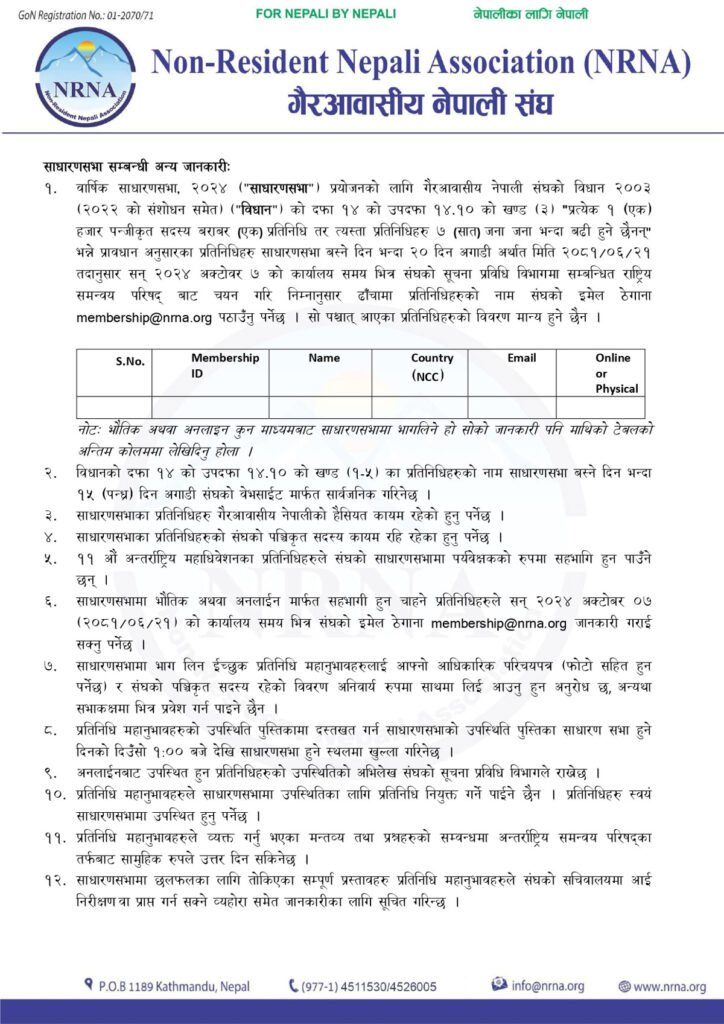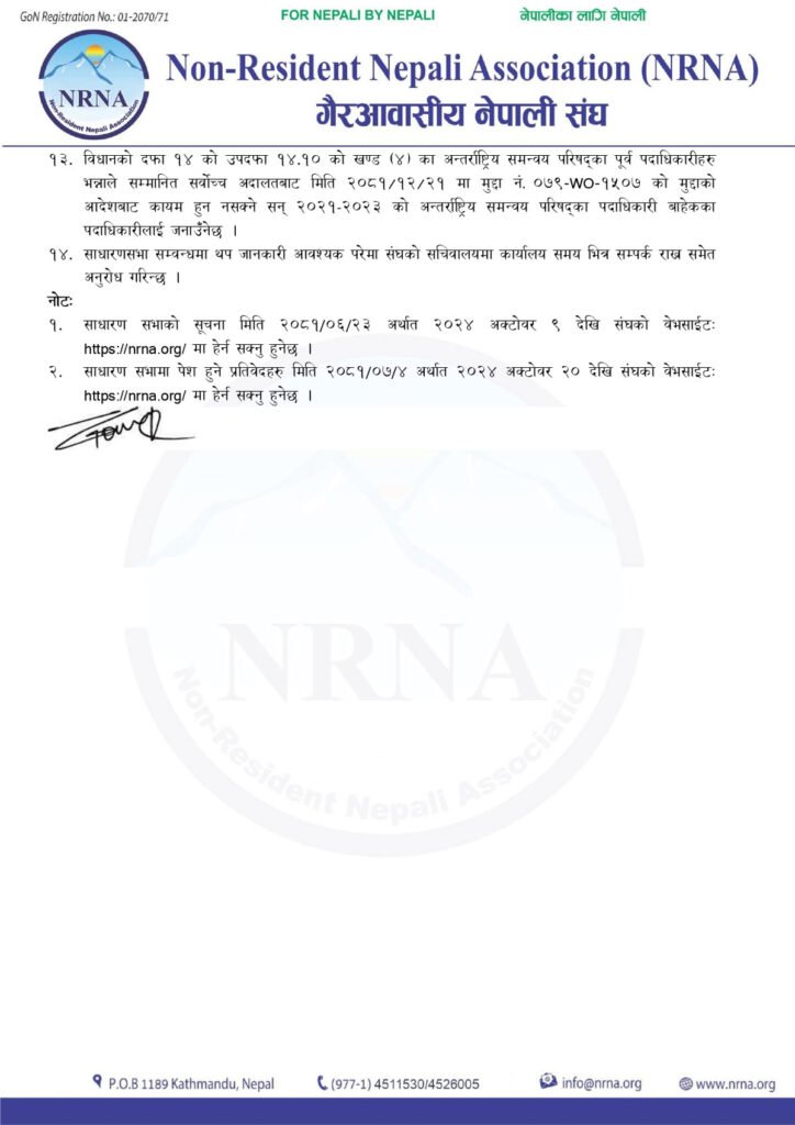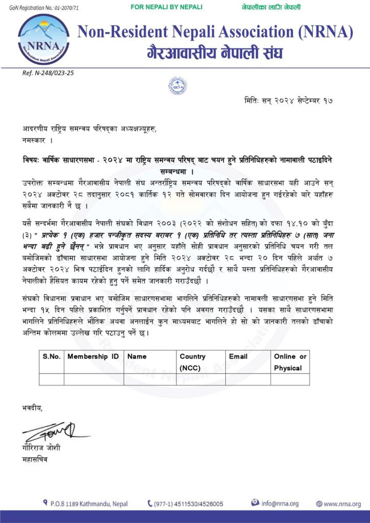 उनले प्रतिनिधि पठाउने अन्तिम मिति अक्टोबर ७ सम्मको समय उल्लेख गरेका छन् । एनआरएन अहिले फेरि विवादित बनेका बेला केसी समूहले गर्न लागेको वार्षिक साधारणसभालाई अर्थपूर्णरुपमा लिइएको छ ।
