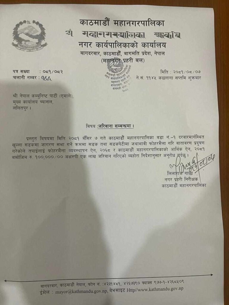 काठमाडौं महानगर पालिकाले सत्तारुढ दल नेकपा एमालेले दरबारमार्गस्थित खुला सडकमा शुक्रबार जागरण सभा गर्ने क्रममा सडक तथा सडकपेटीमा जथाभाबी फोहरमैला गरी वातावरण प्रदूषण भएको भन्दै १ लाख रुपैयाँ जरिवाना गराएको हो ।