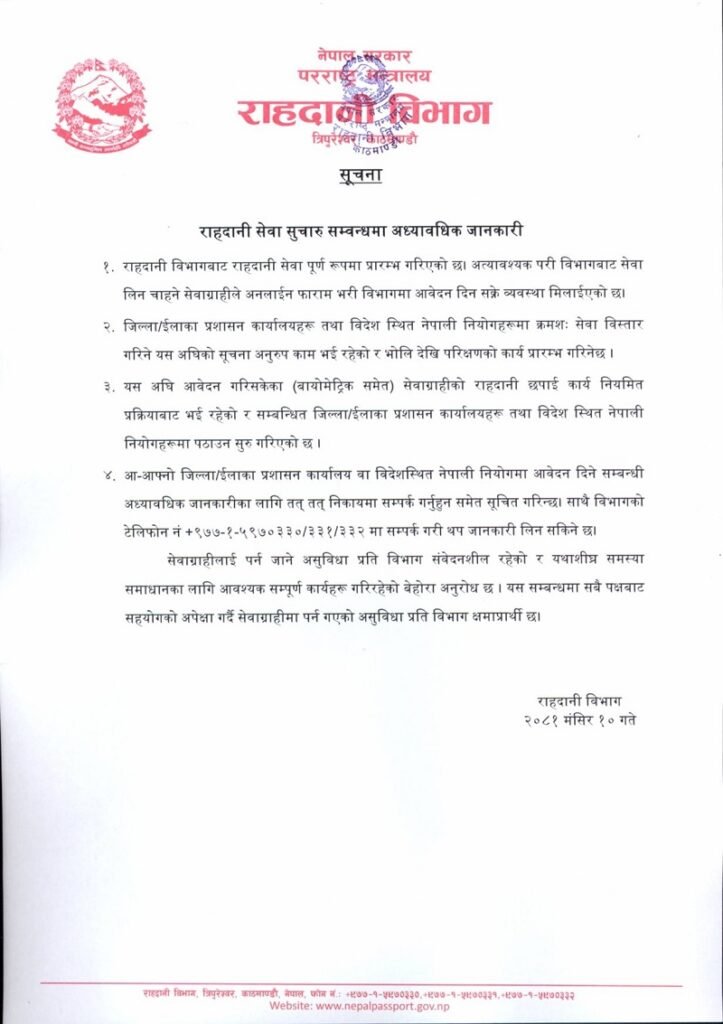 यसअघि आवेदन गरिसकेका अर्थात बायोमेट्रिकसमेत भइसकेका सेवाग्राहीको राहदानी छपाइ नियमित प्रक्रियाबाट भइरहेको र सम्बन्धित जिल्ला/इलाका प्रशासन कार्यालय तथा विदेशमा रहेका नेपाली नियोगहरूमा पठाउन शुरू गरेको सूचनामा उल्लेख छ ।